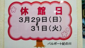 3月29日(日)~31日(火)までは、休館日となっています。