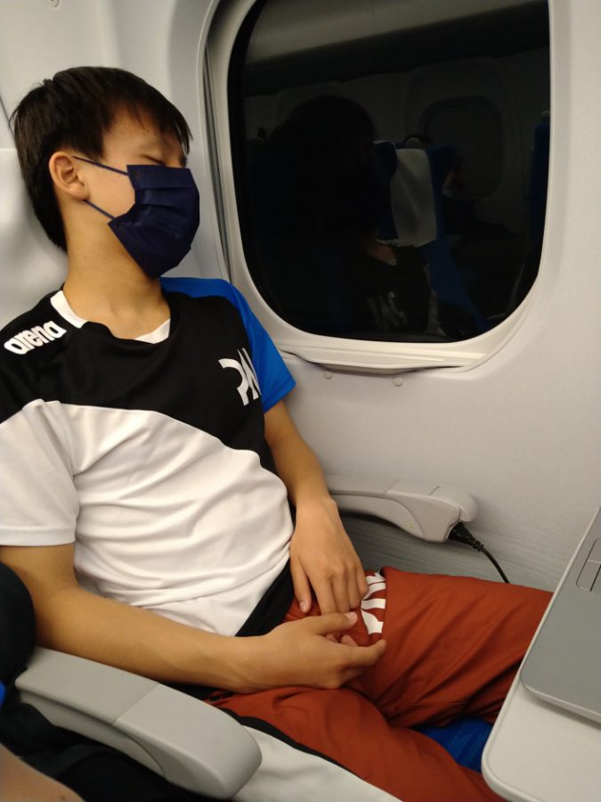 無事に東京辰巳国際水泳場へ辿り着き、アップ開始時間までスタンドで休憩中。