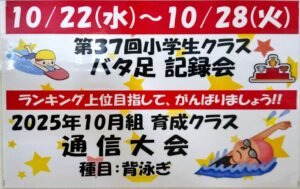 小学生クラスは25mバタ足。育成クラスは25m背泳ぎ・50m背泳ぎになります。