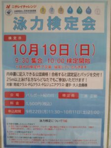 泳力検定会は、パルポートの級とは違い、年齢別に基準のタイムが決められており、25m種目の7級から200m個人メドレーの1級に分けられています。
