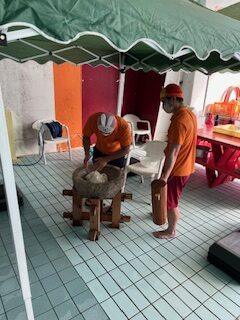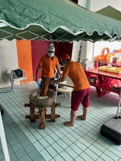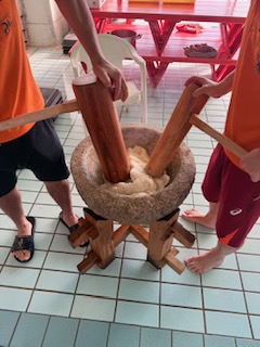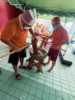 もち米を蒸して柔らかくしてから、杵を使ってお米をおもちになるまで捏ねたり、ついたりしました。
